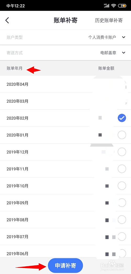 6.在【账单补寄】页面选择需要补寄的账单年代,点击下方申请补寄即可。