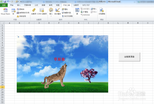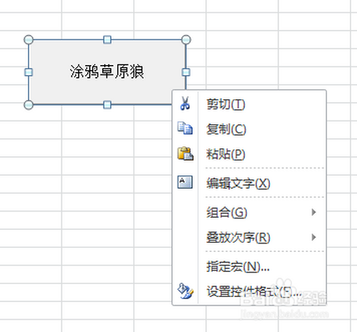 7.将按钮控件定名为“涂鸦草原狼”,然后点击右键,选择“指定宏”选项。