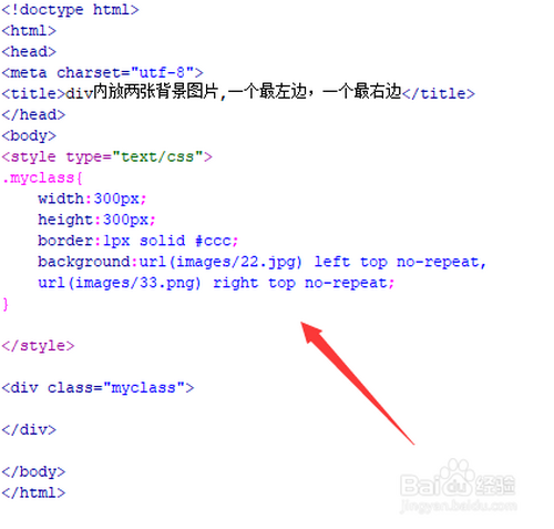 2、在css标签内,利用background设置div的布景图片,在设置布景图片的同时,利用left top设置第一张布景图片在左上角,利用right top设置第二张布景图片在右上角。