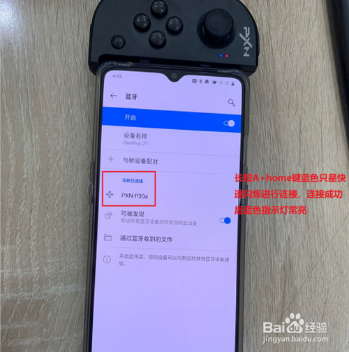 操作手柄“A+HOME”键毗连手机蓝牙,显示p30a毗连当作功。