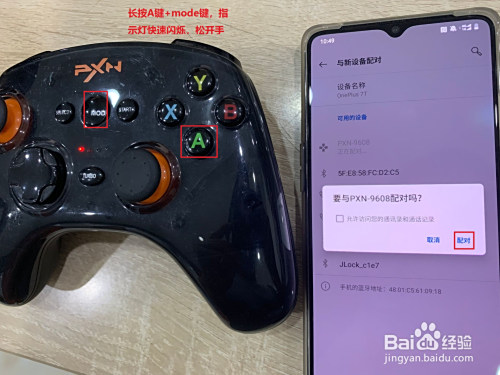 手柄关机状况,长按“A键+mode键”指示灯快速闪灼松开手,然后开启蓝牙开关,点击搜刮毗连第一个识别到的蓝牙标识符,毗连当作功后会显示已毗连【pxn-9608】手柄型号。