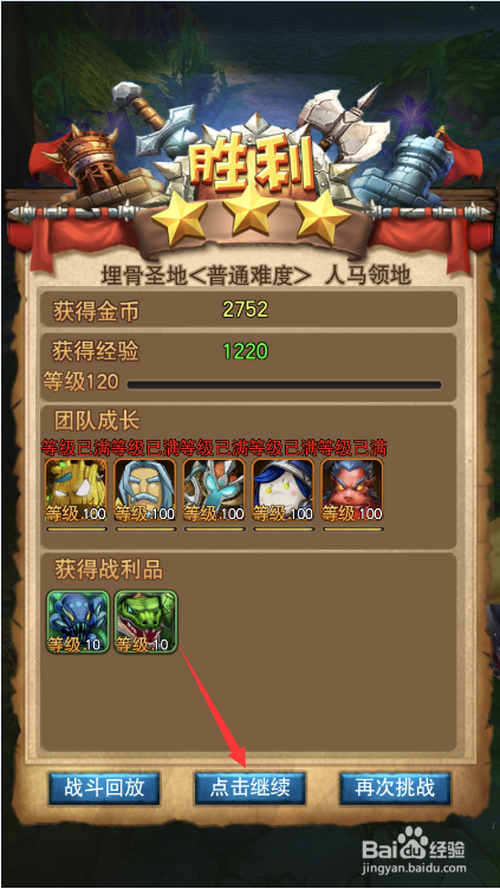 本关卡奖励1220点经验,点击下方点击继续按钮分开副本。