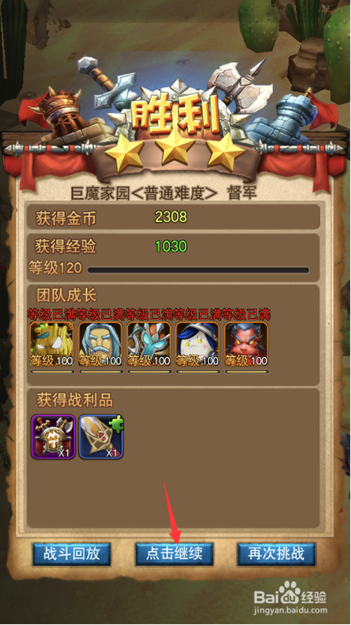 本关卡奖励1030点经验,点击下方点击继续按钮分开副本。