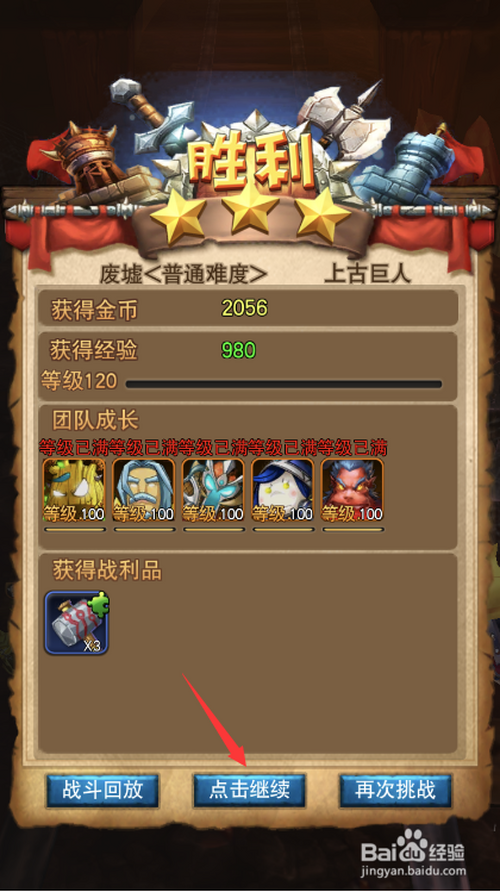 本关卡奖励980点经验,点击下方点击继续按钮分开副本。