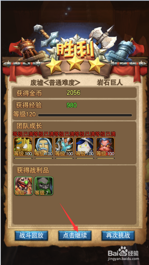 本关卡奖励980点经验,点击下方点击继续按钮分开副本。
