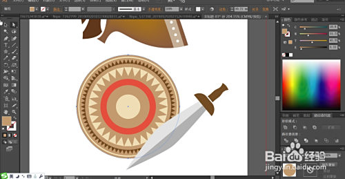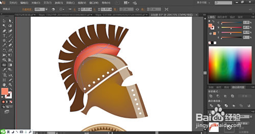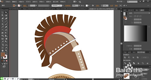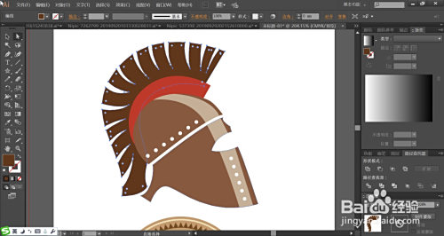 利用米灰色、灰棕色、桔红色搭配填充盾牌的内部图案,再用网格东西点击盾牌的内部让其呈现渐变色的金属材质结果。