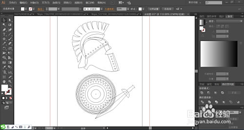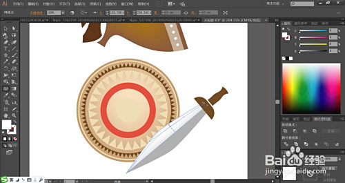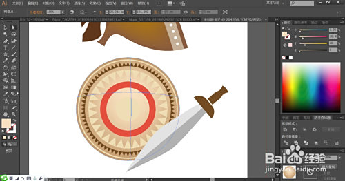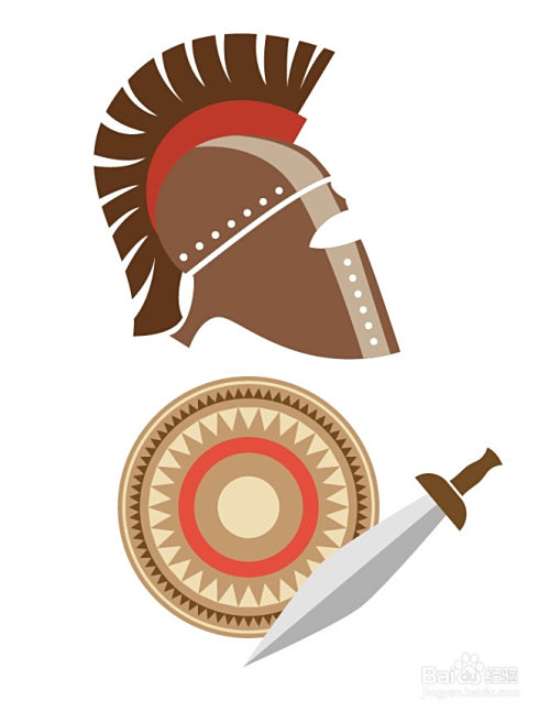 最后,我们用明暗灰白色填充刀刃,再用红棕色填充手柄,利用网格东西点击刀刃的亮光路径让其呈现渐变色的结果,完当作头盔盾牌图片设计。
