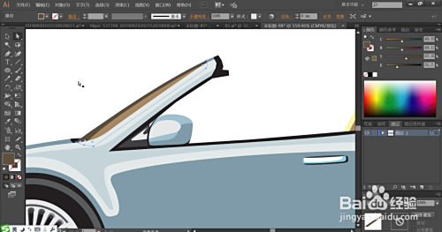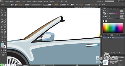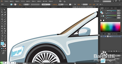 车前窗利用明暗茶色搭配填充,车窗的边缘利用蓝白色填充。不雅后镜利用三种明度的蓝灰色填充,正面为高光,下边缘为暗光。