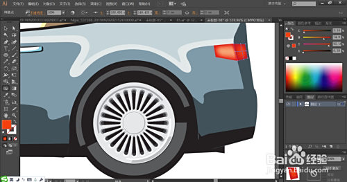 利用明暗大红色填充后车灯,再用网格东西别离给车灯的左侧与右侧做出渐变色的结果,利用灰黑色与灰色搭配填充车轮的轮胎,再用灰白色填充钢圈的本家儿体路径。