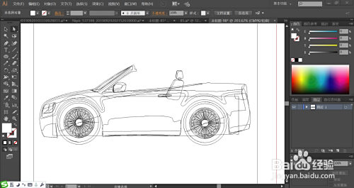 利用钢笔车出敞篷车的根基轮廓,再画出它的车轮细节路径,重点绘制车轮钢圈上面的明暗光线路径,接着,我们画出车体的正面与车灯的细节路径。