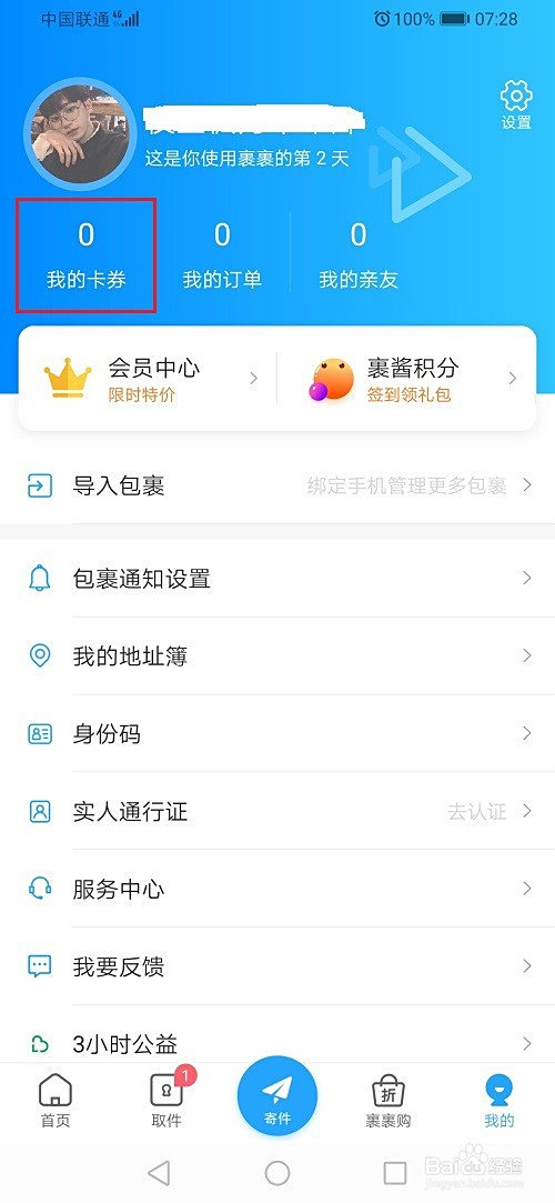 第二步打开菜鸟裹裹,进去我的界面,点击我的卡劵,如下图所示:
