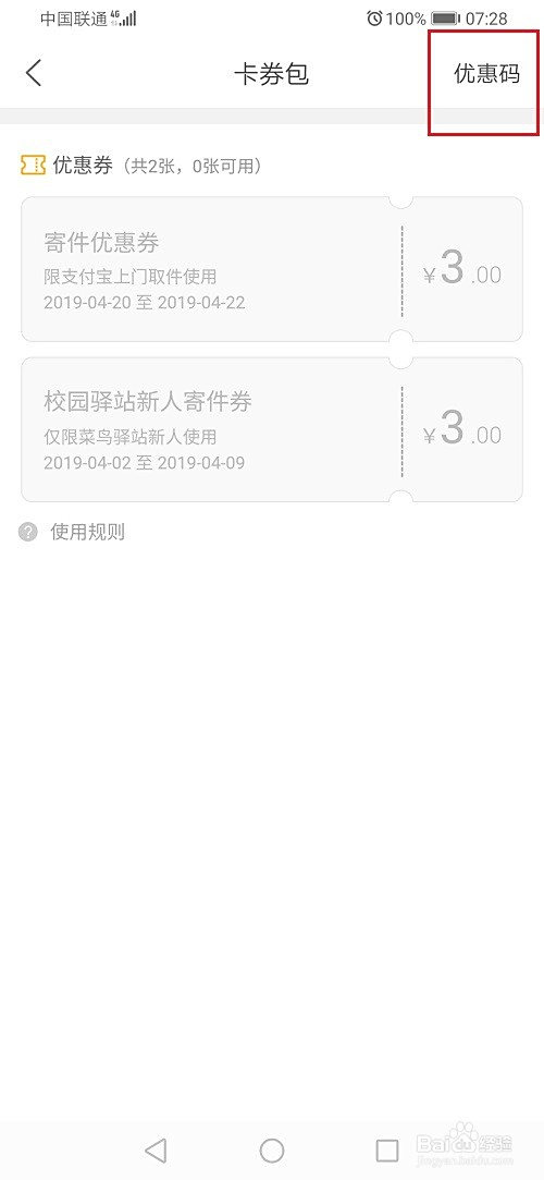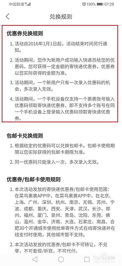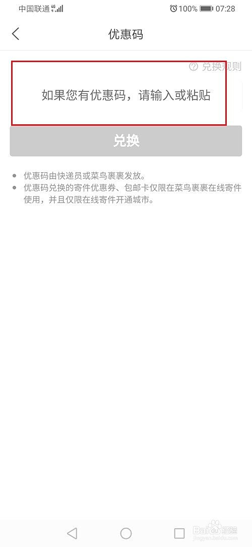 第一步菜鸟裹裹的优惠码可以用于兑换优惠劵和包邮卡,如下图所示: