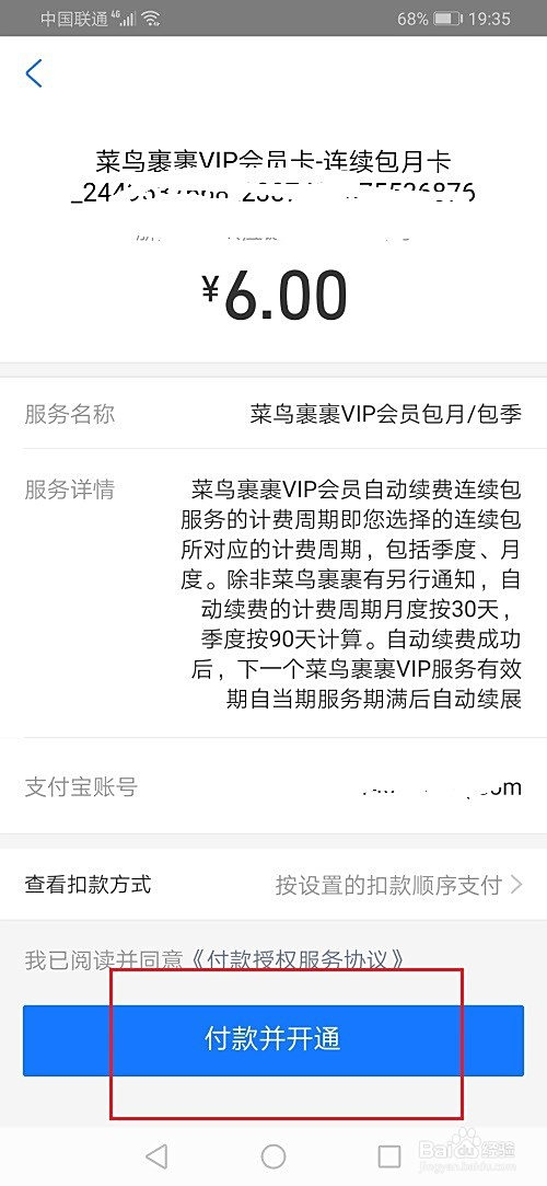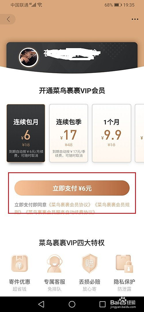 第四步进去菜鸟裹裹会员开通界面之后,选择开通会员的时长,点击当即支付,如下图所示: