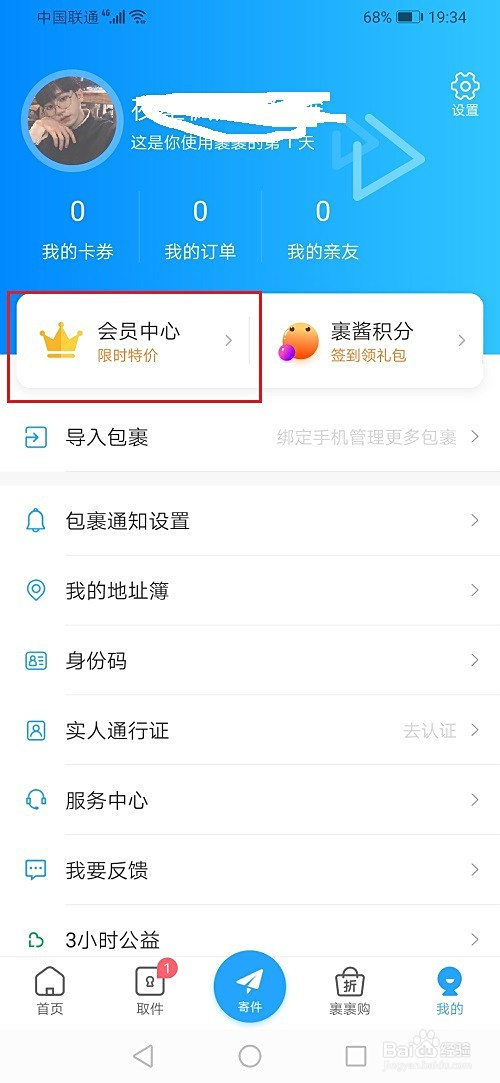 第二步在菜鸟裹裹我的界面,点击会员中间,如下图所示: