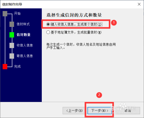 选择生当作信封的数目,这里选择的是生当作单个信封,接着点击“下一步”