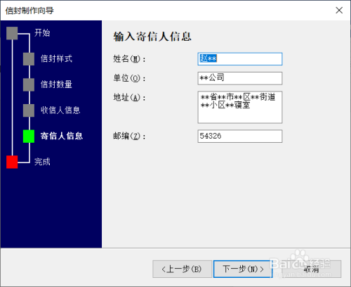 输入寄件人的姓名、地址邮编等根基信息,接着点击“下一步”