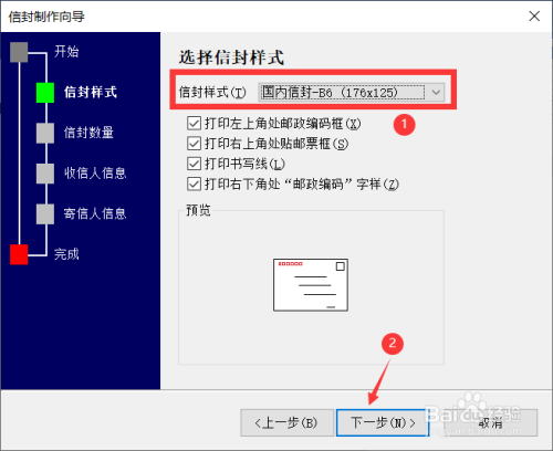 然后选择信封的样式,这里选择的是国内信封-B6,接着点击“下一步”