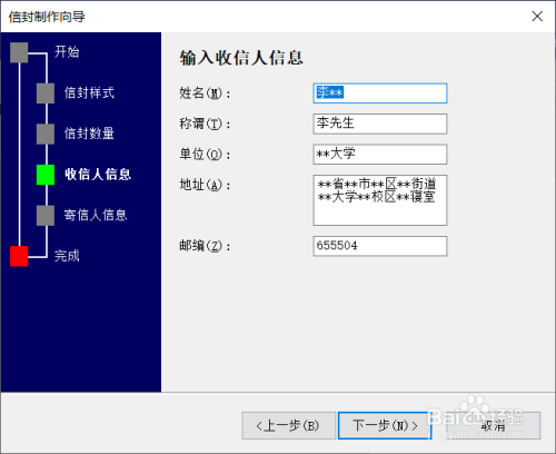 输入收件人的姓名、地址邮编等根基信息,接着点击“下一步”