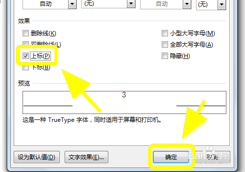 在字体对话框的结果中,选择并点击【上标】,然后点击【确定】;