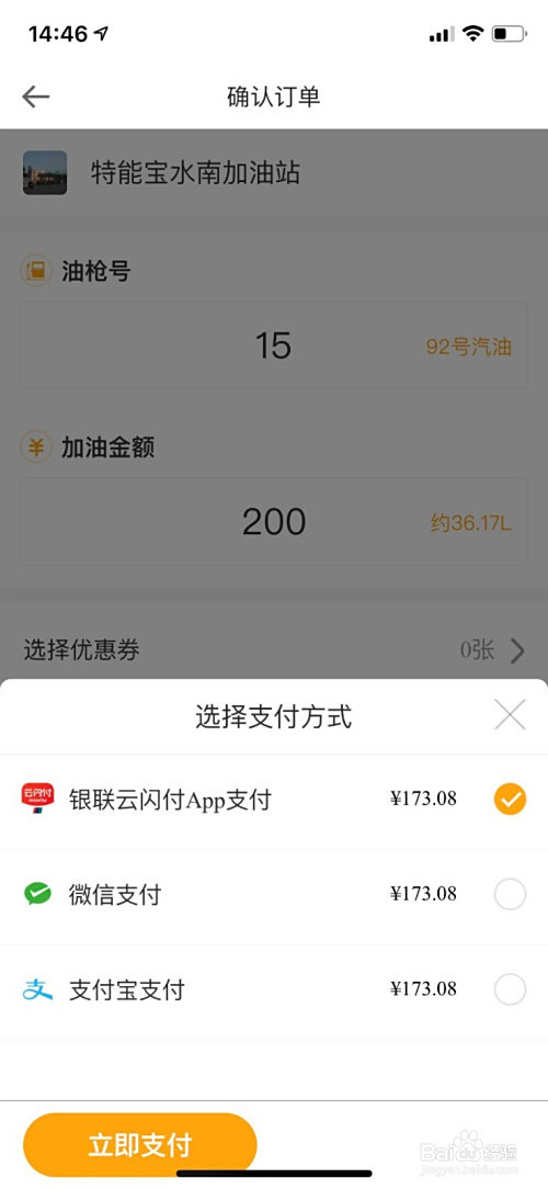 进入如下图,选择支付体例,支付完当作后,加油站收银台会主动打印出相对应的单据,您只要跟收银台的工作人员报个油枪号即可。