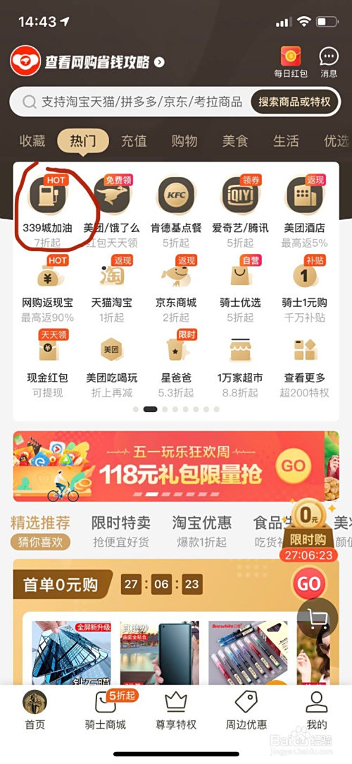 点开下载好的全球购骑士特权APP,在首页栏,可以看到如下图圈起来的‘339城加油’,然后点击它。