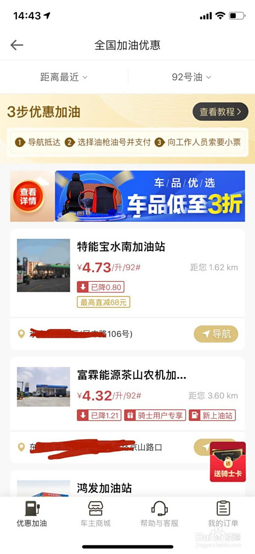 进入如下图‘全国加油优惠’,这里会按照您的位置,供您选择距离比来/价钱最低的排序,显示所有撑持全球购骑士卡加油的加油站。按照距离与价钱确认好想去的加油站,然后点击它。