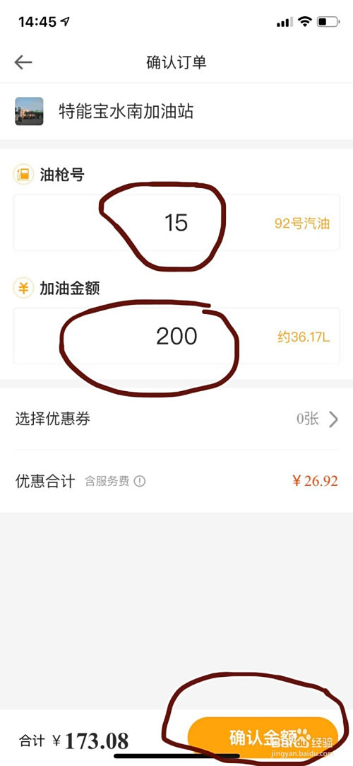 进入如下图‘确认订单’,这时期待油枪加好油。加好油后将对应的油枪号与油价输入到如图的对应位置,优惠几多,应付几多城市主动计较出来,然后点击如图按钮‘确认金额’