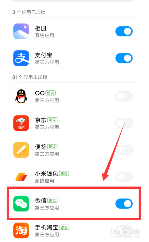 在弹出的应用中找到微信点击开启,这样就给微信设置了应用锁,即给微信设置了登录暗码,再进入就需要输入暗码