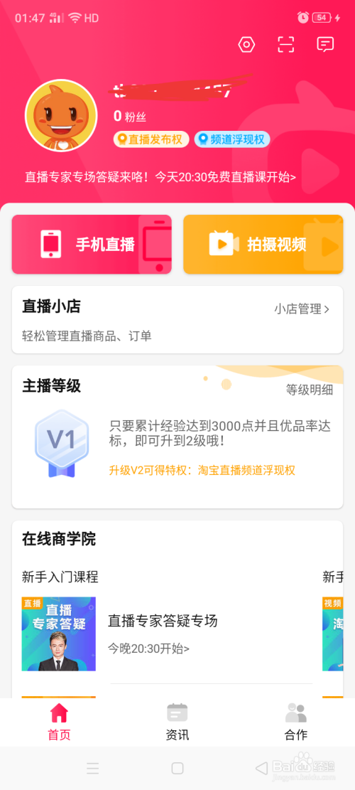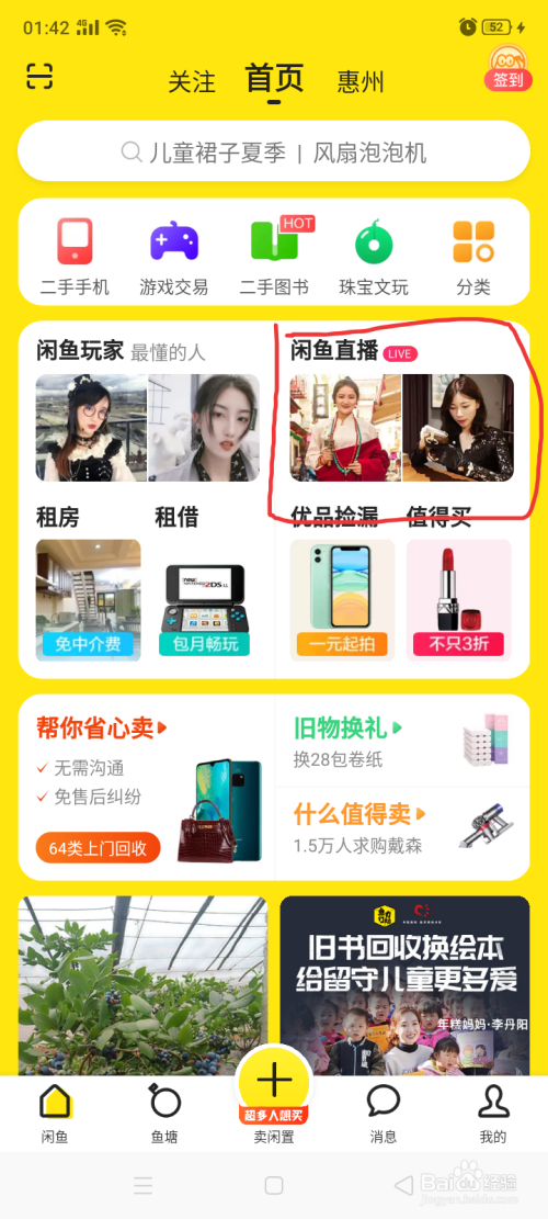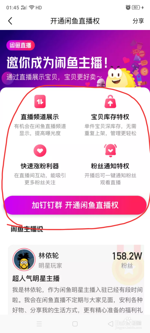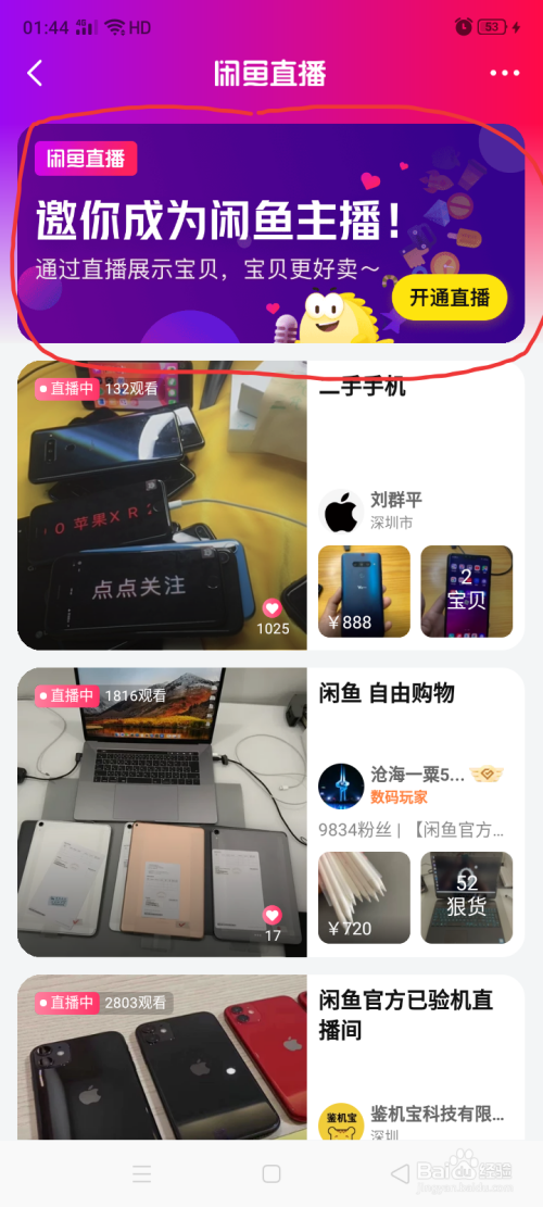 点击闲鱼直播,进入后banner右滑,点击开通直播