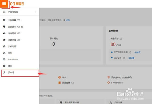 打开阿里云节制台(console.aliyun.com),点击左上角菜单按钮,点击“云市场”。