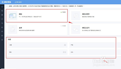 在网站办理界面中,上方的“网站”点击即可进入网站信息设置界面,下方是文章、产物等内容的办理。
