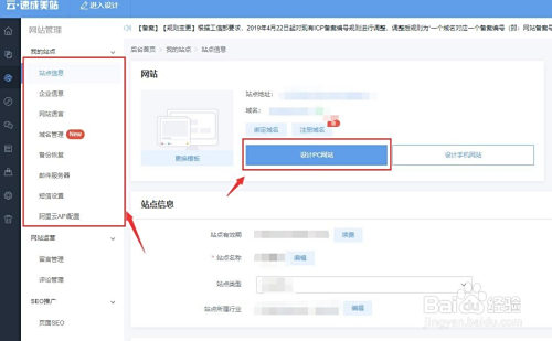 在网站信息设置界面中,左侧的菜单栏可以选择各类信息进行设置。我们点击右侧按钮进入PC端的网站设计界面。