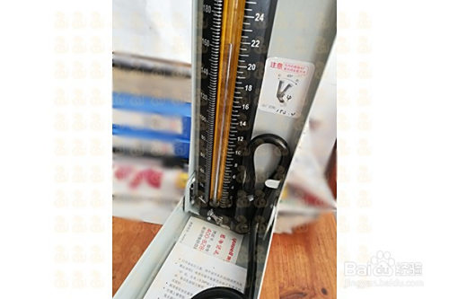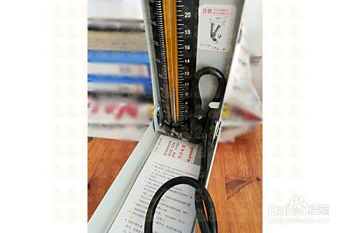 继续放气,图中水银柱位置声音俄然消逝,提醒舒张压为90mmHg。