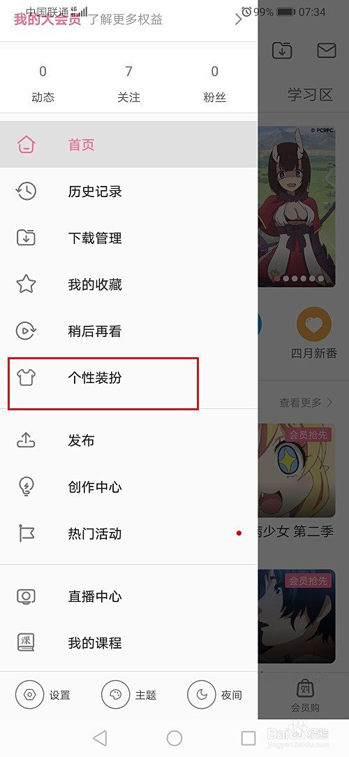 第二步打开哔哩哔哩侧边栏之后,点击个性装扮,如下图所示: