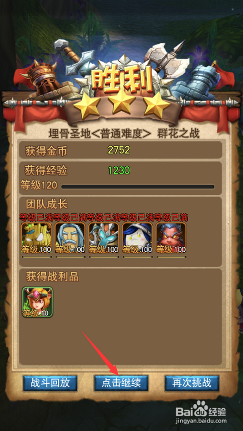 本关卡奖励1230点经验,点击下方点击继续按钮分开副本。