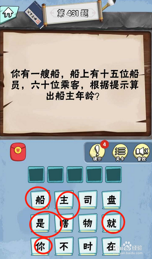 脑子急转弯达人游戏Lv6绝代奇才第431关内,提问您有一艘船,船上有十五位船员,六十位乘客,按照提醒算出船长的春秋。