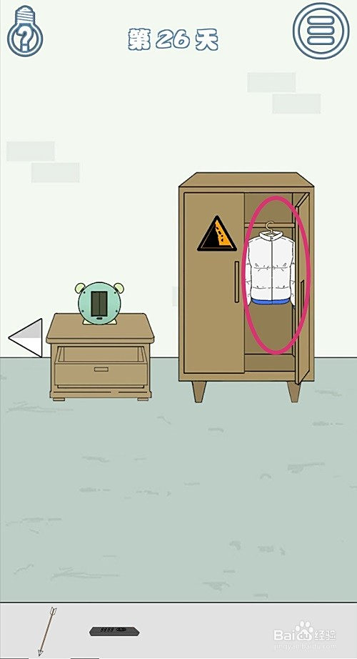 用【钥匙】打开柜子门上的锁,点击打开右扇门,可以获得一件【羽绒服】。