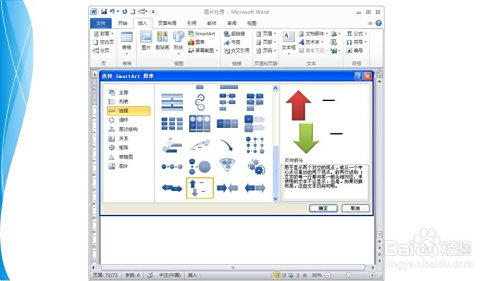 点击插入选项卡——插图组——SmartArt按钮。在跳出的对话框架中选择反标的目的箭头图。