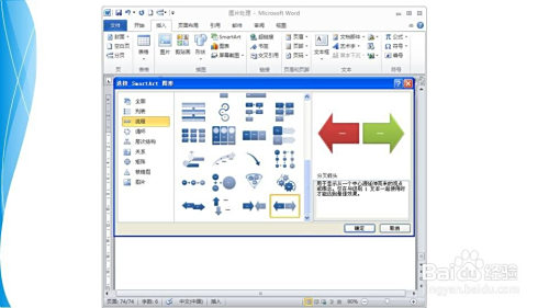点击插入选项卡——插图组——SmartArt按钮。在跳出的对话框架中选择分叉箭头图。