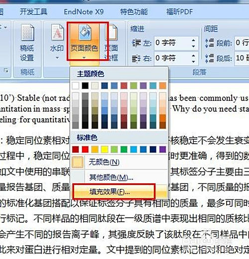 找到“页面布景”东西栏中的“页面颜色”选项,单击打开下拉菜单,点击“填充结果”。