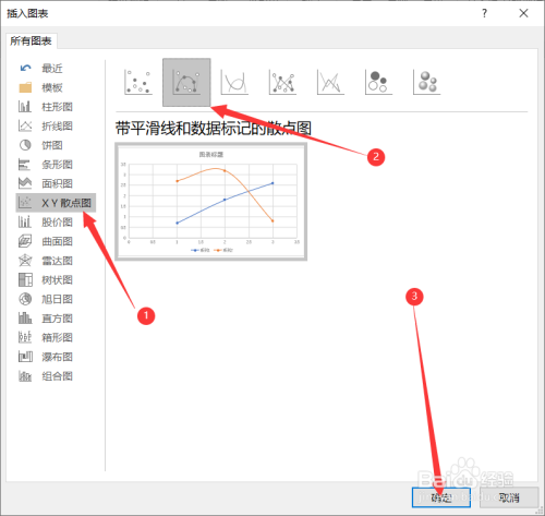 在弹出的页面中点击“散点图”,接着选择“待光滑曲线和数据标点的散点图”,最后点击“确定”