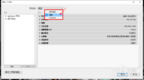 在导出一个文件面板,顶部点击【导出到】下拉框,可以选择将照片导出到硬盘、电子邮件或者CD/DVD。