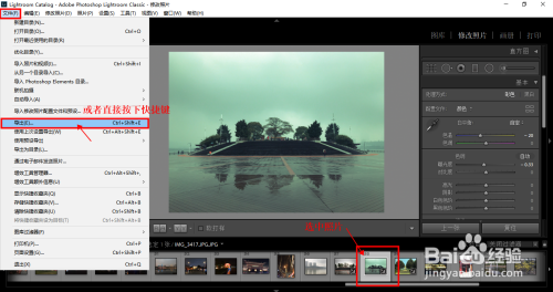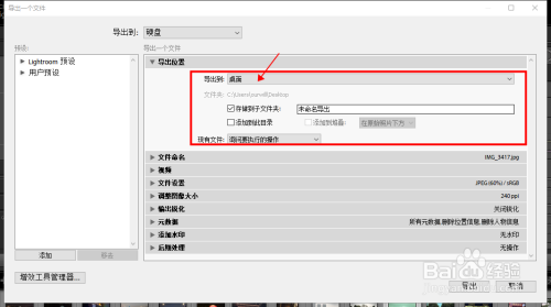 选中需要导出的照片,然后点击菜单栏的【文件】->【导出】,或者按下快捷键ctrl+shift+E,调出导出一个文件面板。在该面板中可以设置输出信息。