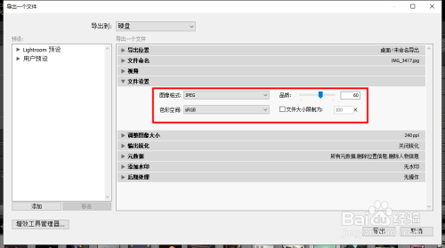 在文件设置中可以设置照片的输出格局、色彩空间、品质以及图片巨细限制。