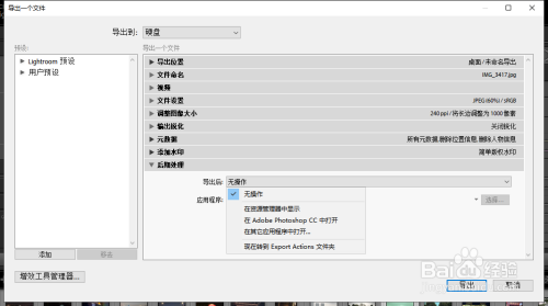 后期处置,顾名思义即在照片导出完当作后,需要做什么。Lr中供给了误操作、在办理器中打开、在photoshop中打开等五种选项。