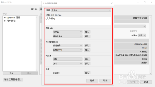 在文件定名模块可觉得要导出的照片从头定名。点击重定名下拉框中的编纂,可以自界说名称格局。