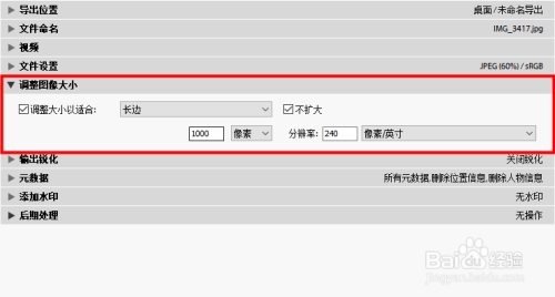 Lr在调节照片时是无法设置图片巨细的,而是在导出时设置的。在调整图片巨细模块,勾选调整巨细以适合,就可以对照片进行巨细设置了。