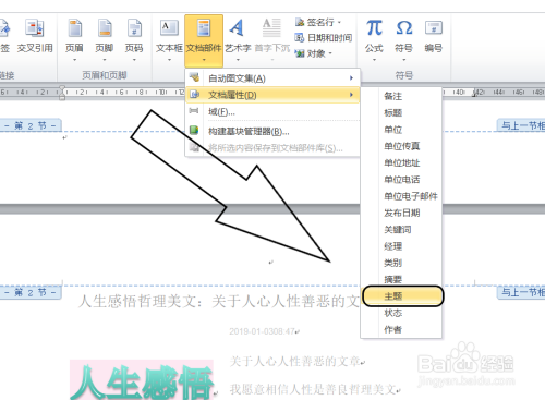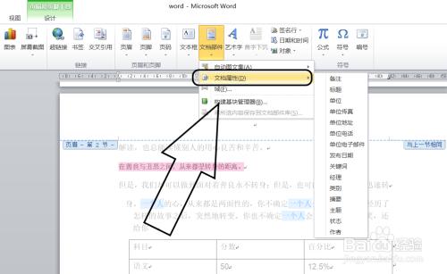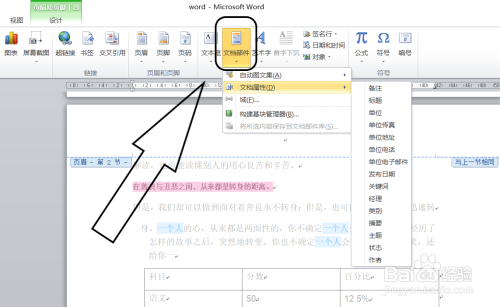 6.在“文档部件”下拉列表中选择“文档属性”。