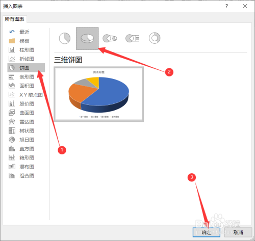 在弹出的页面中点击“饼图”,接着选择柱形图的类型,这里选择的是“三维饼图”,最后点击“确定”