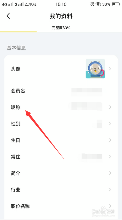 最后,我们我们在弹出的小我资料界面中,即可对本身的昵称进行设置。